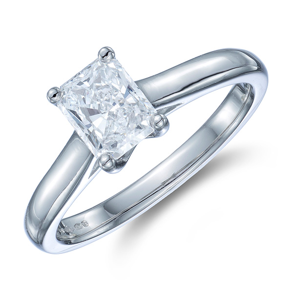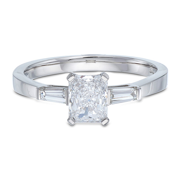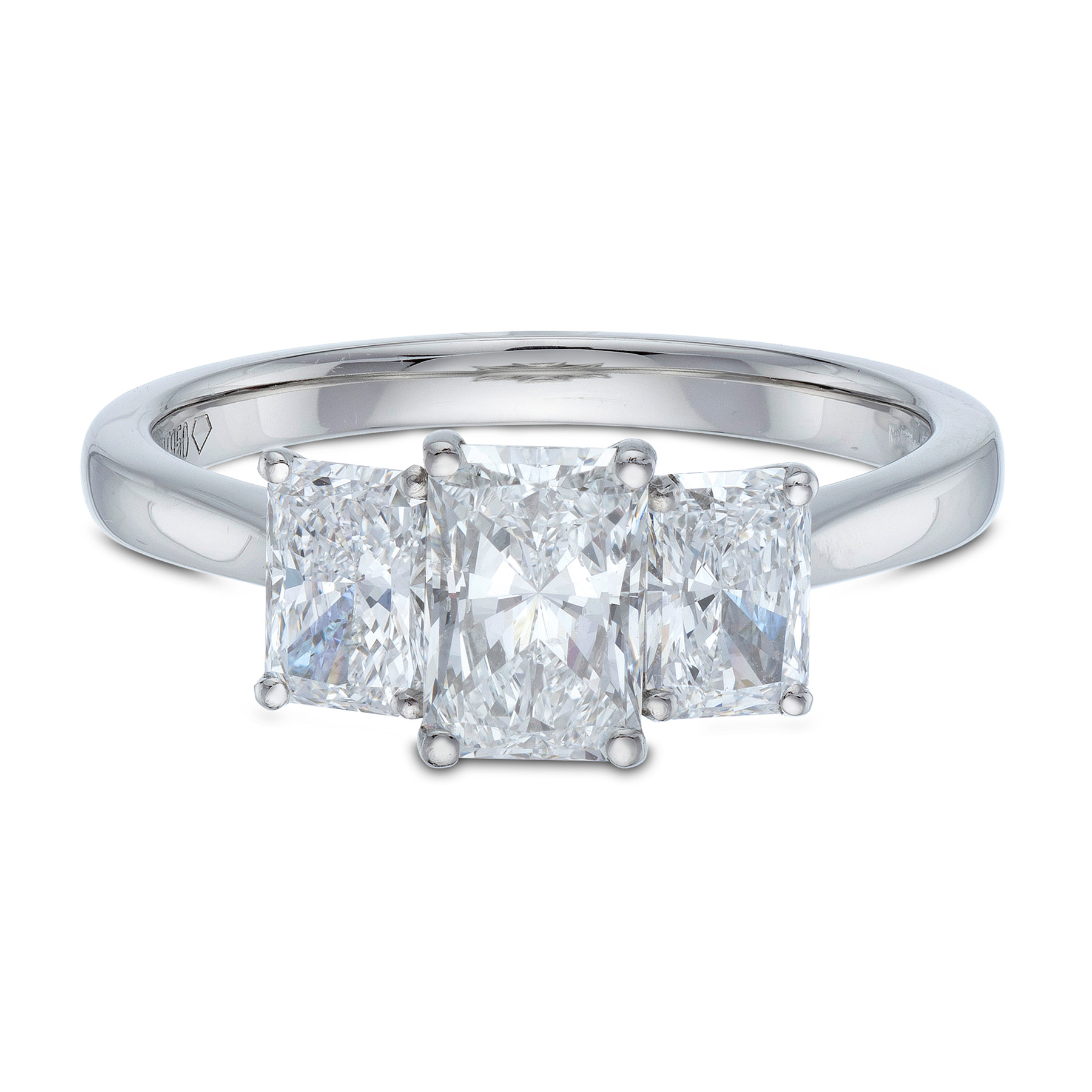 One mesmerising GIA certified, radiant cut diamond sits perfectly in the centre of this modern three stone ring, a further two sensational radiant cut diamonds nestle at either side, all finished in platinum, creating a beautiful take on a classic.