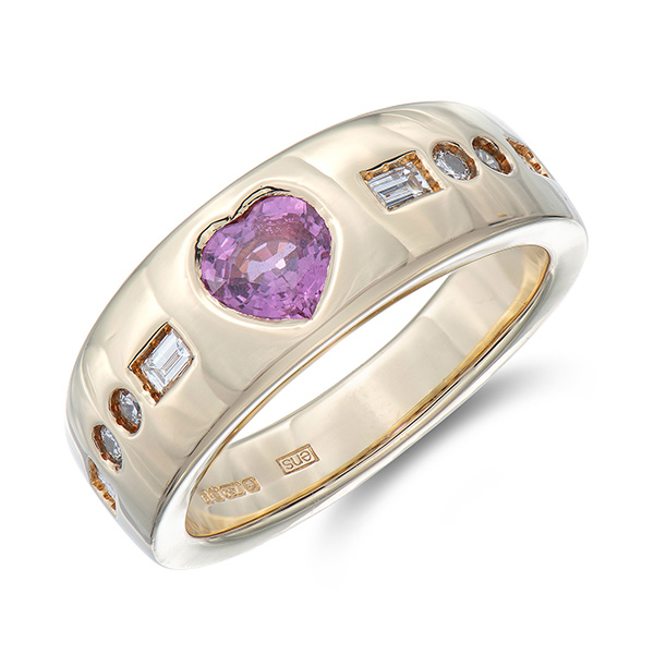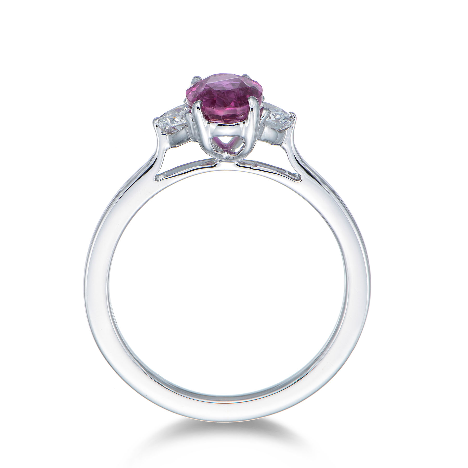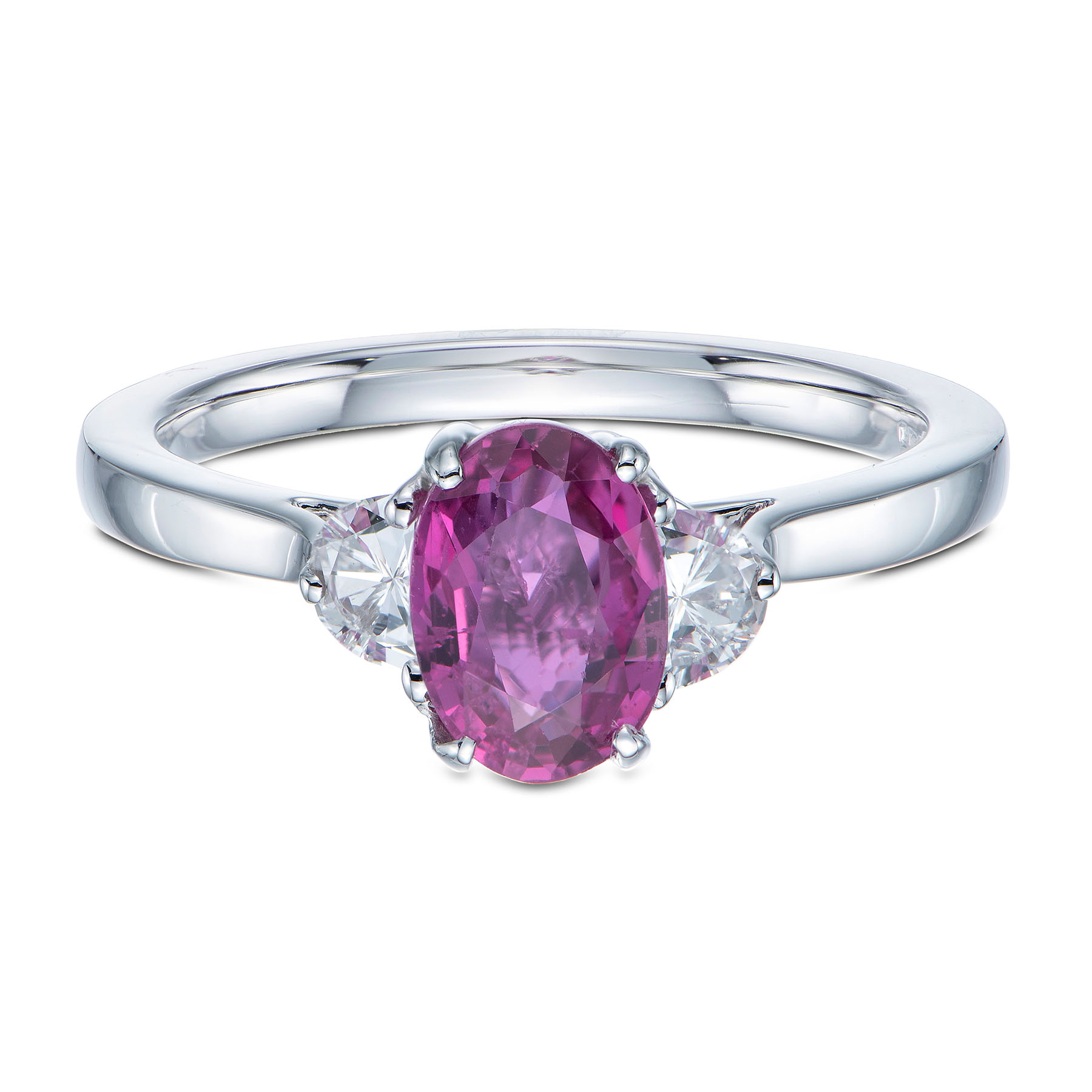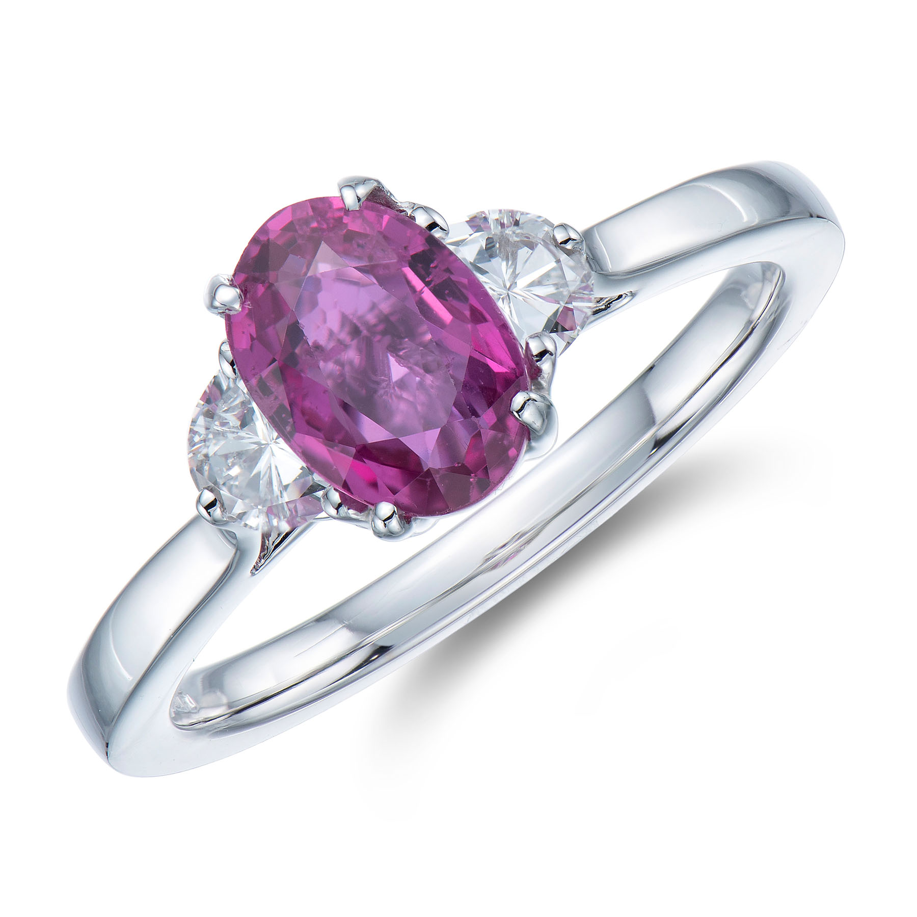 This gorgeous piece is set with one shimmering oval cut pink sapphire and perfectly partnered with two exquisite half moon cut natural diamonds, glistening in 18ct white gold, all in a classic claw setting.