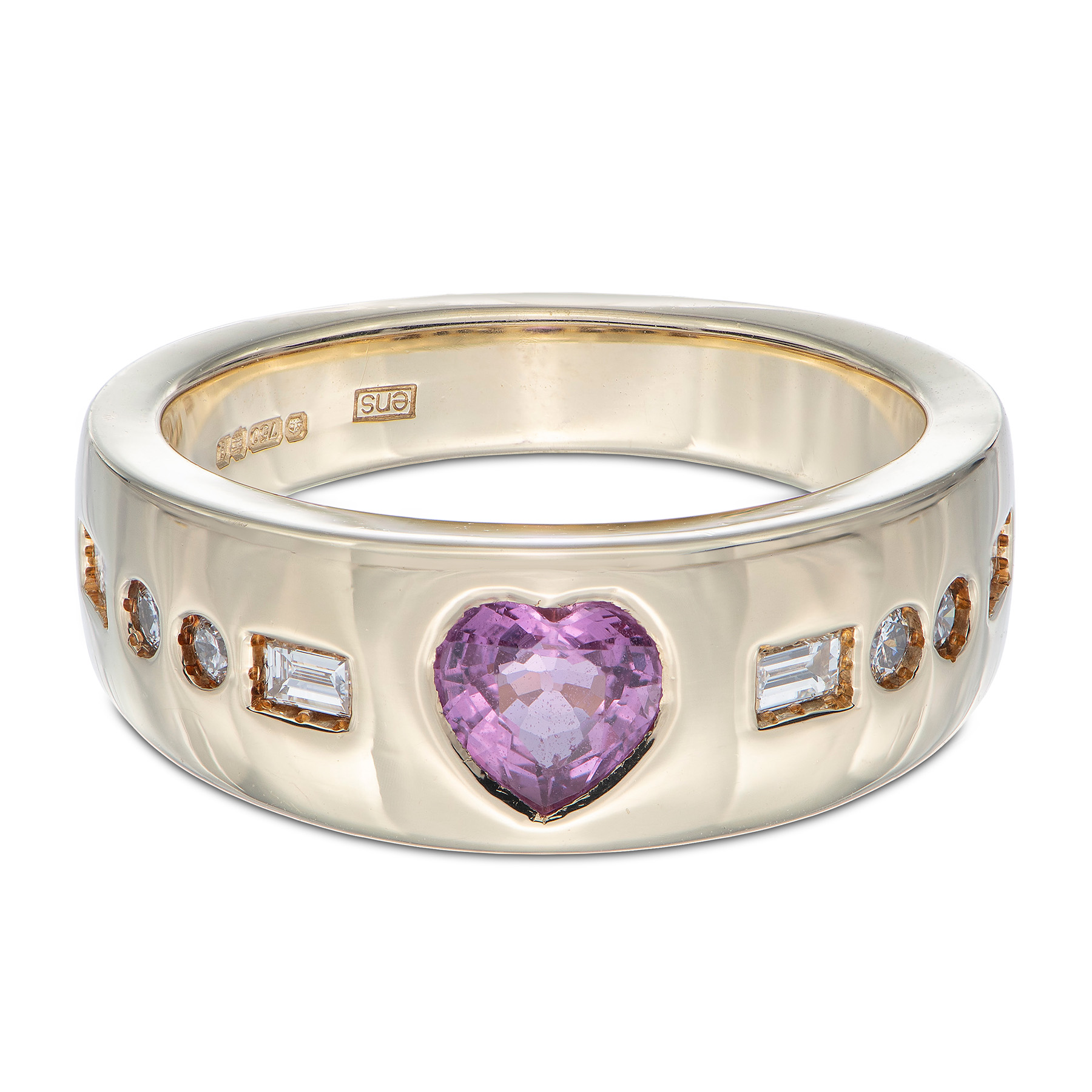 This stunning ring is set with a gorgeous heart cut pink sapphire set between a combination of sparkling round brilliant and baguette cut natural diamonds all bound in a beautifully robust heavy 18ct yellow gold band.