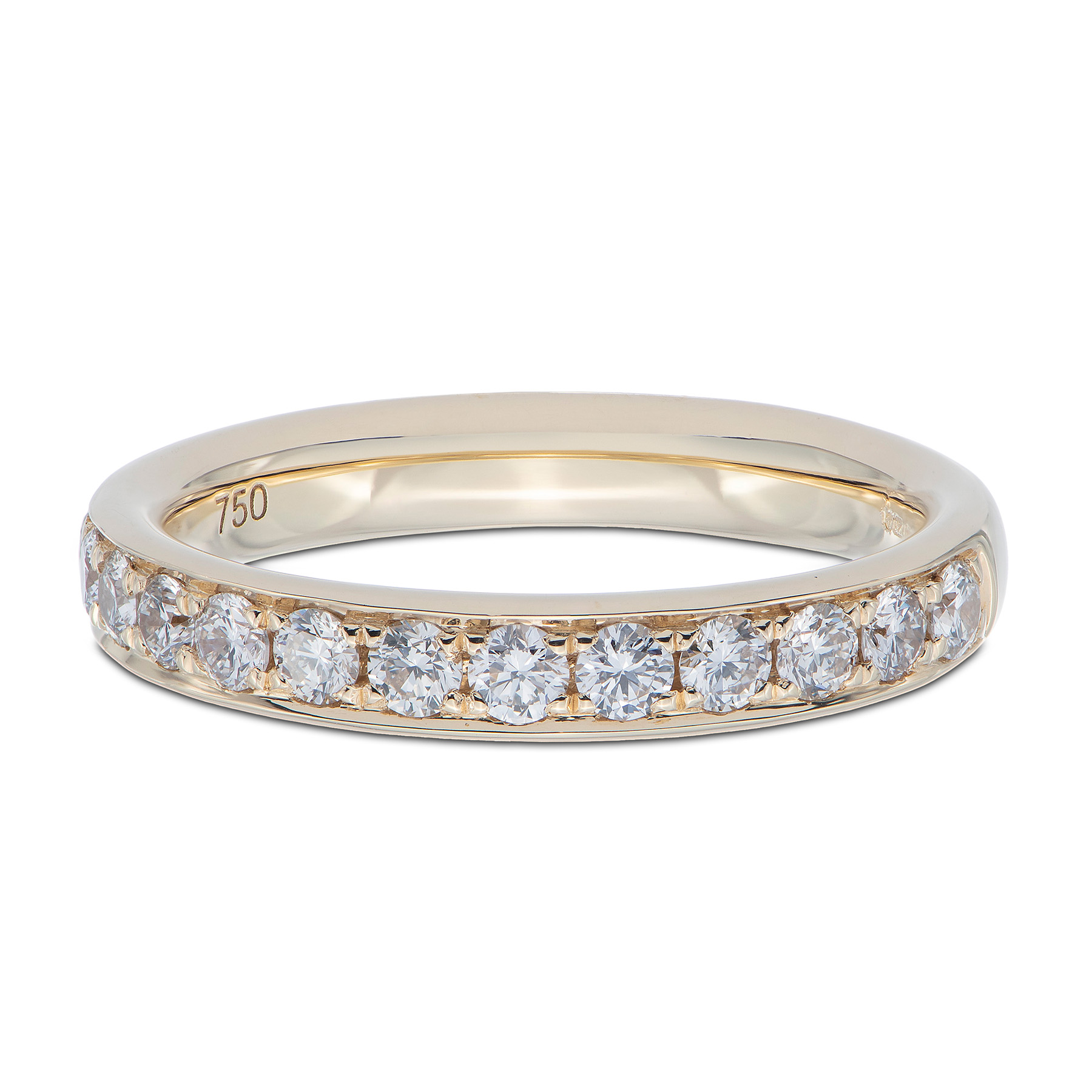 This sparkling yellow gold eternity style ring shimmers with thirteen round brilliant cut natural diamonds, all set in a beautiful grain style setting, perfect to match with your engagement ring or wedding band.
