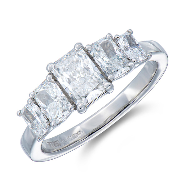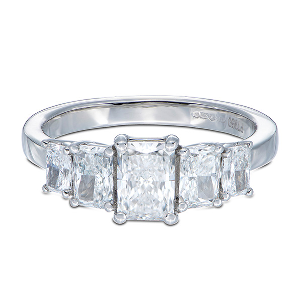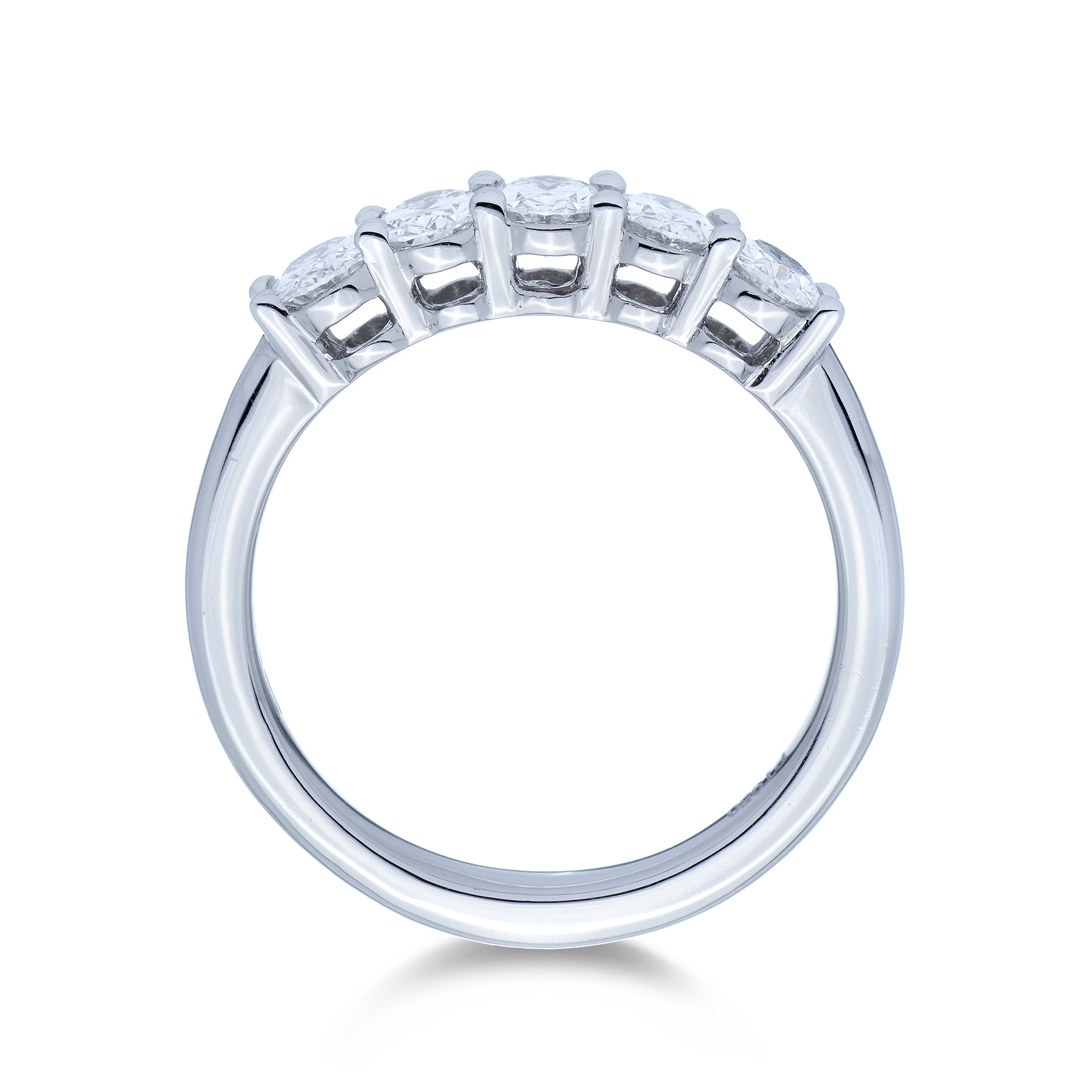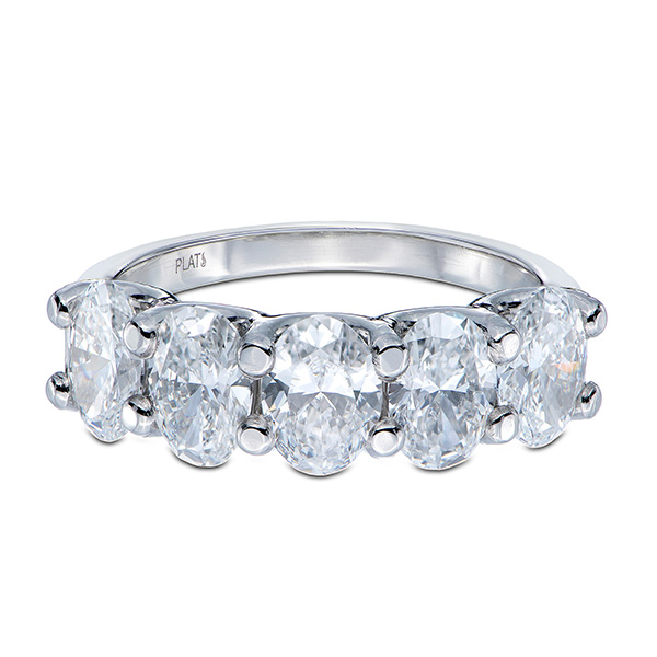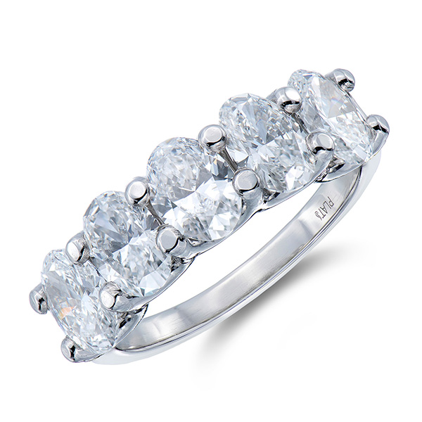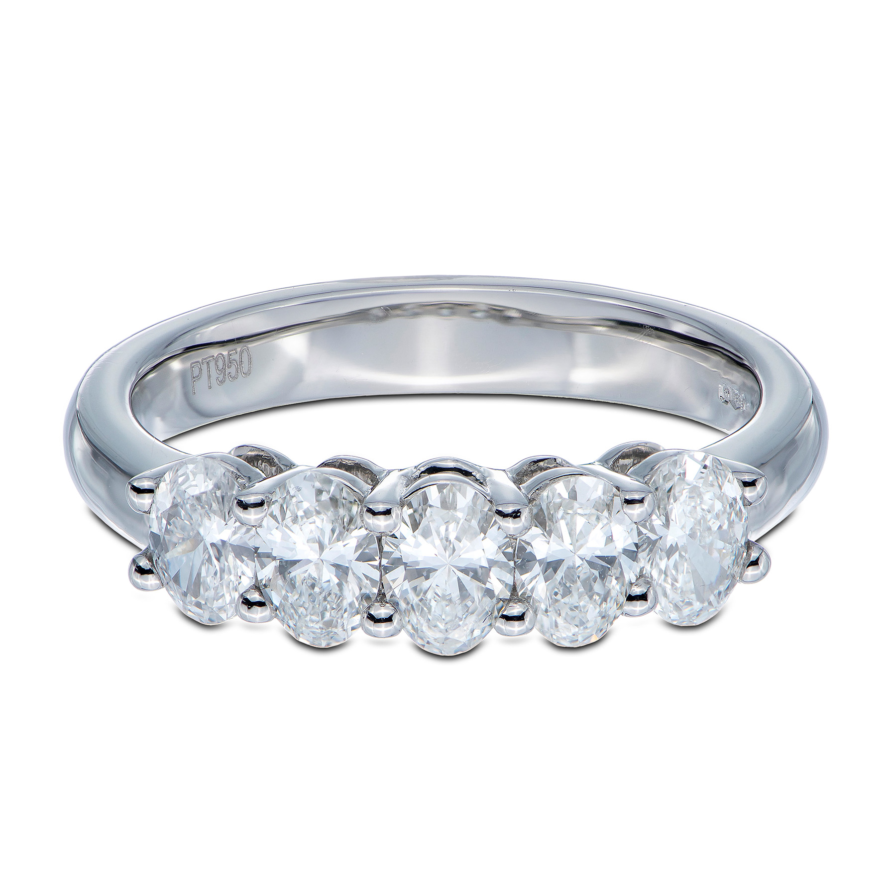 This extraordinary ring showcases five sensational oval cut diamonds set side by side in a eternity style design, each diamond embraced beautifully in platinum, in a classic four claw setting. This versatile ring could be worn on its own or to compliment an existing engagement ring.