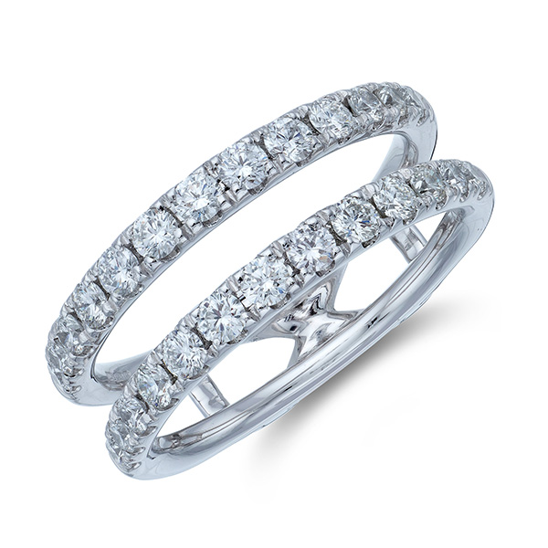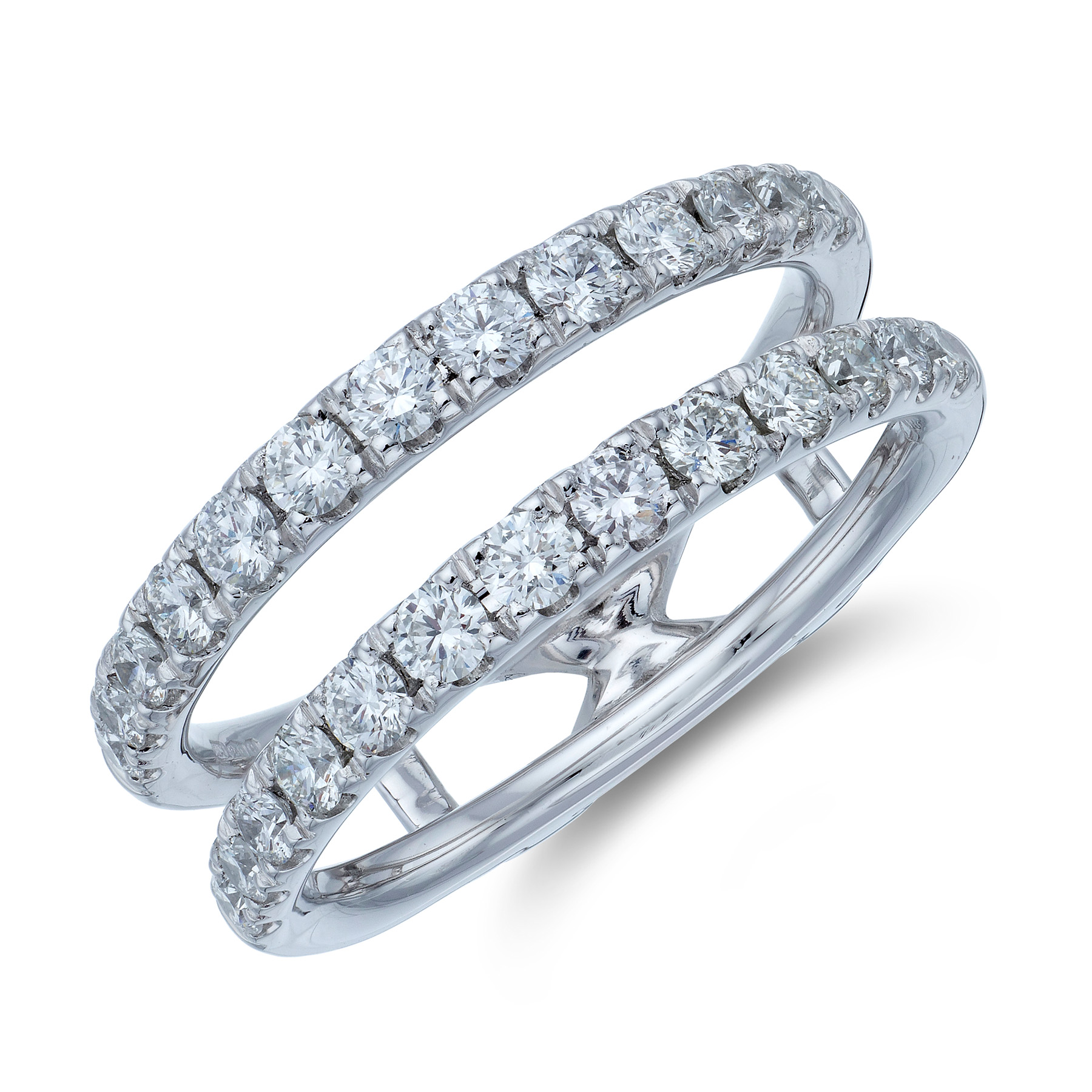 Elevate your engagment ring by placing it between two rows of mesmerising round brilliant cut diamonds, 40 beautifully sparkling round brilliant cut diamonds are housed perfectly in a open, double band to cradle your existing ring, all set in platinum in an elegant 4 claw setting. A contemporary take on a classic.