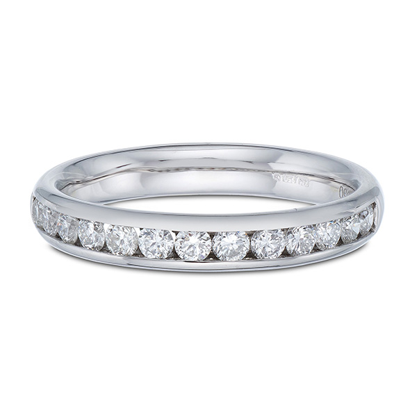 This wonderfully classic designed ring is set with ten radiant, perfectly matched round brilliant cut diamonds all beautifully bound in platinum in a secure channel setting.