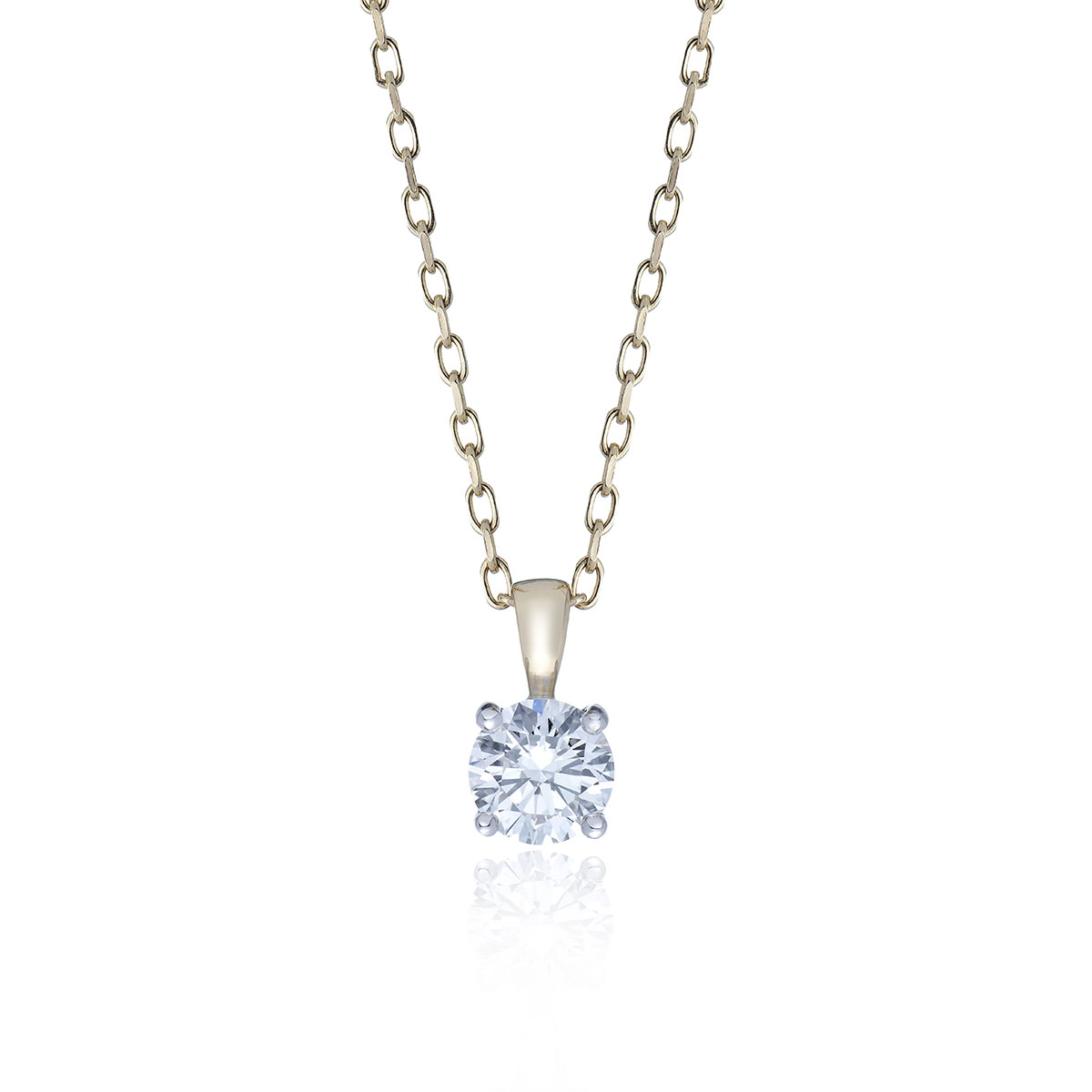 This gorgeous classic single stone pendant is set with one sparkling certified round brilliant cut lab grown diamond bound in a bright white gold four claw setting with an 18ct yellow gold chain. An absolute perfect piece for any occasion or for just being glamorous every day.