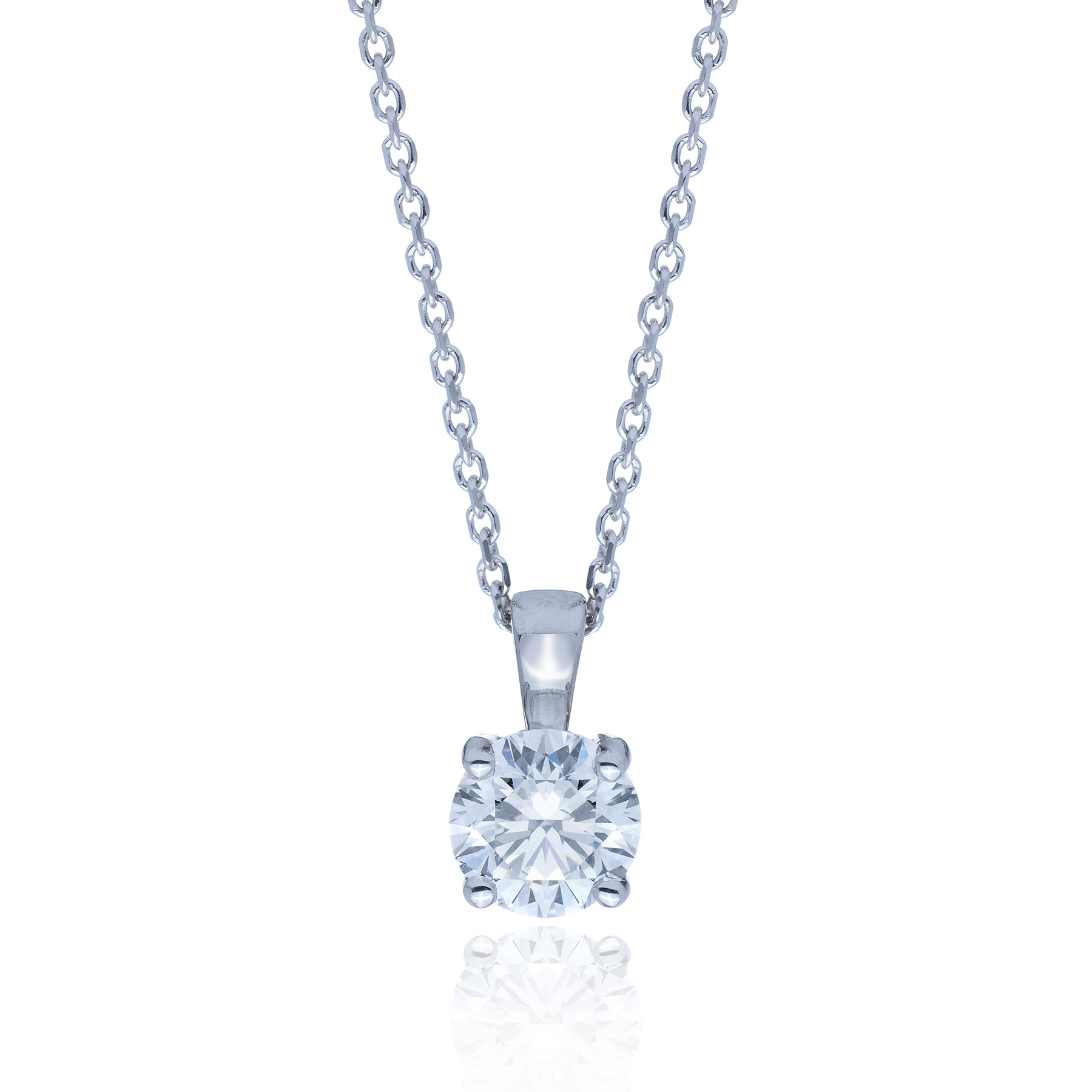 This beautifully classic single stone pendant is set with one dazzling certified round brilliant cut lab grown diamond bound in a bright white gold four claw setting with a sparkling white gold chain. An absolute perfect piece for any occasion or for just being glamorous every day.