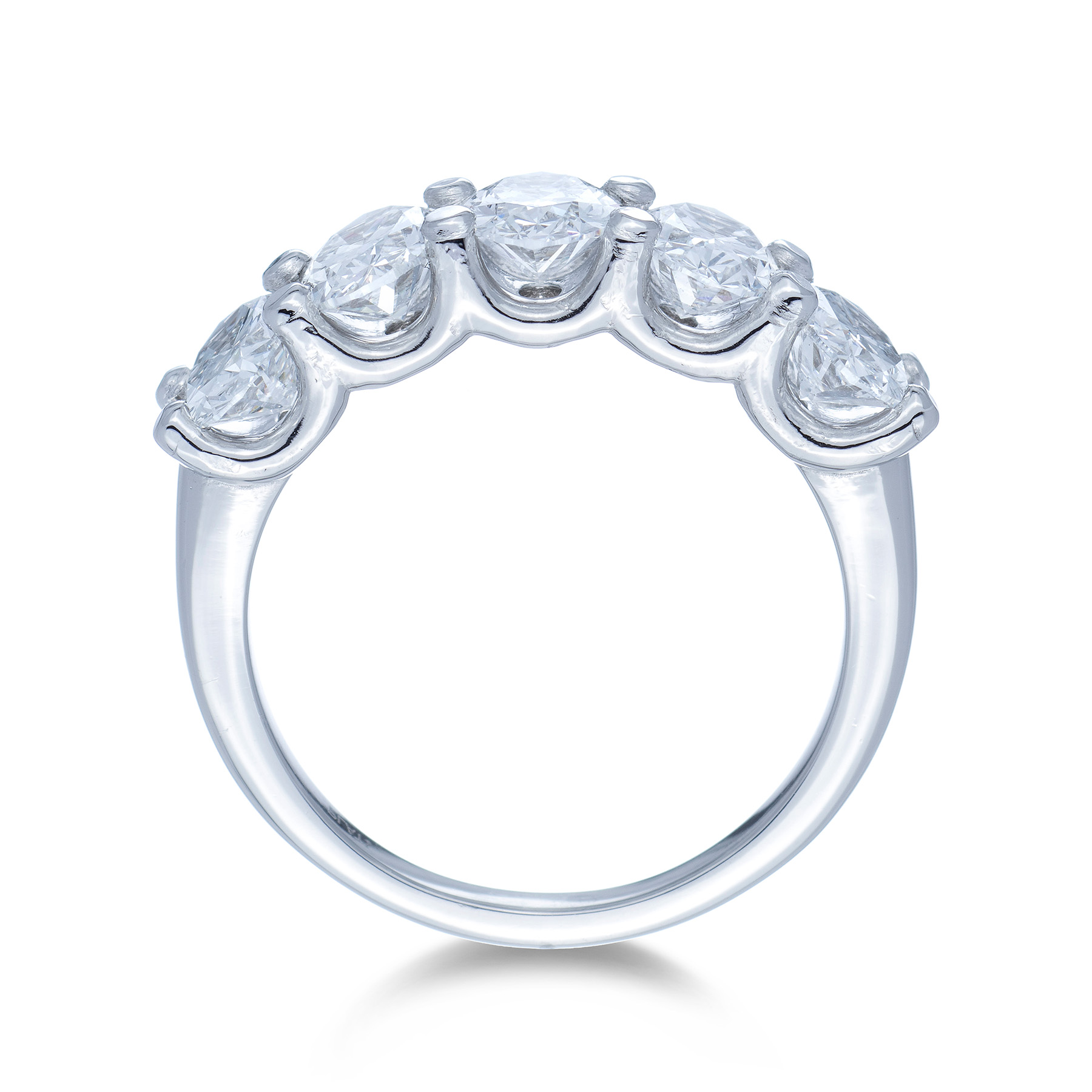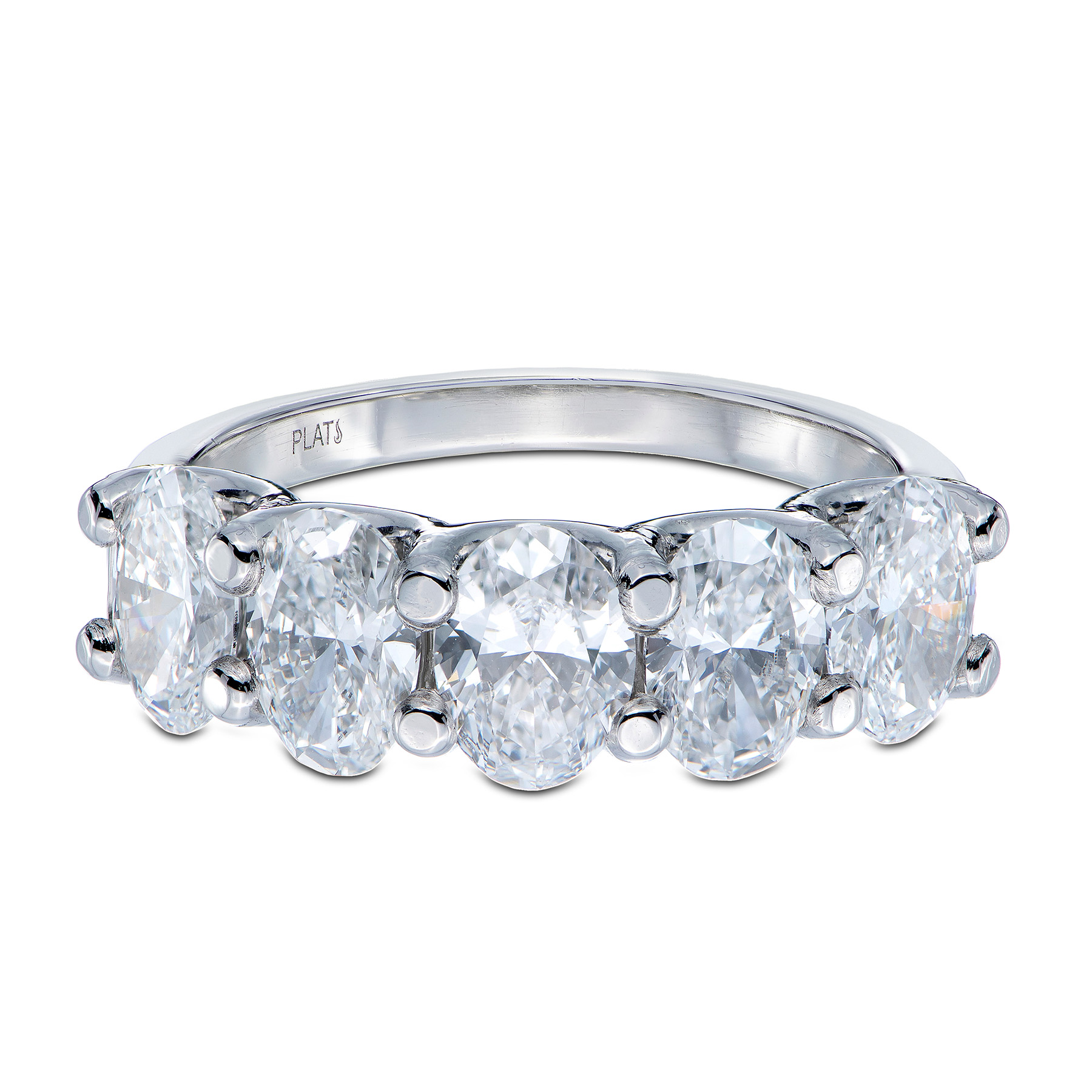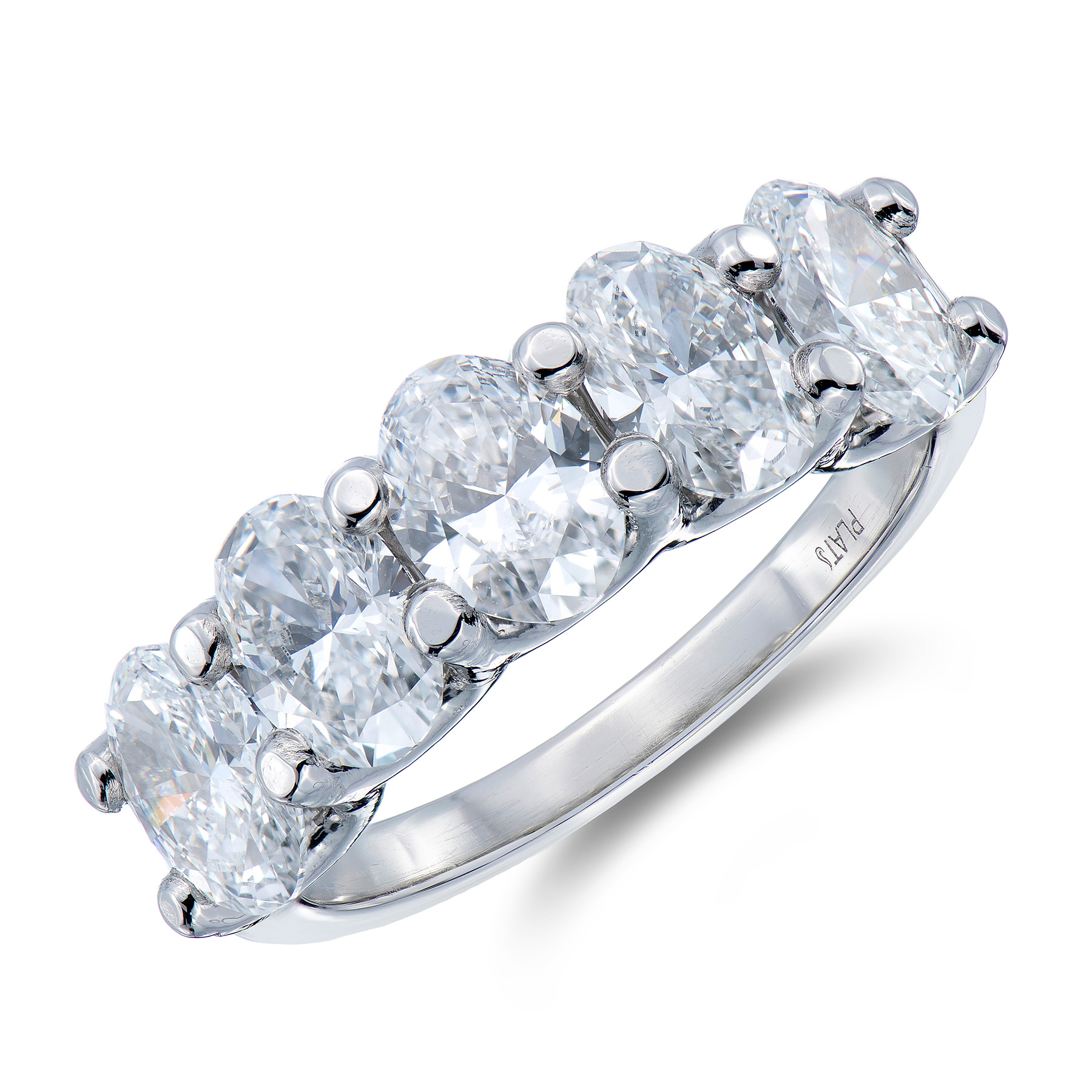 Five certified sparkling oval cut lab grown diamonds are all set side by side in this gorgeous eternity style ring and bound together each in a beautifully open u-shaped four claw platinum setting. Quite a show stopper!