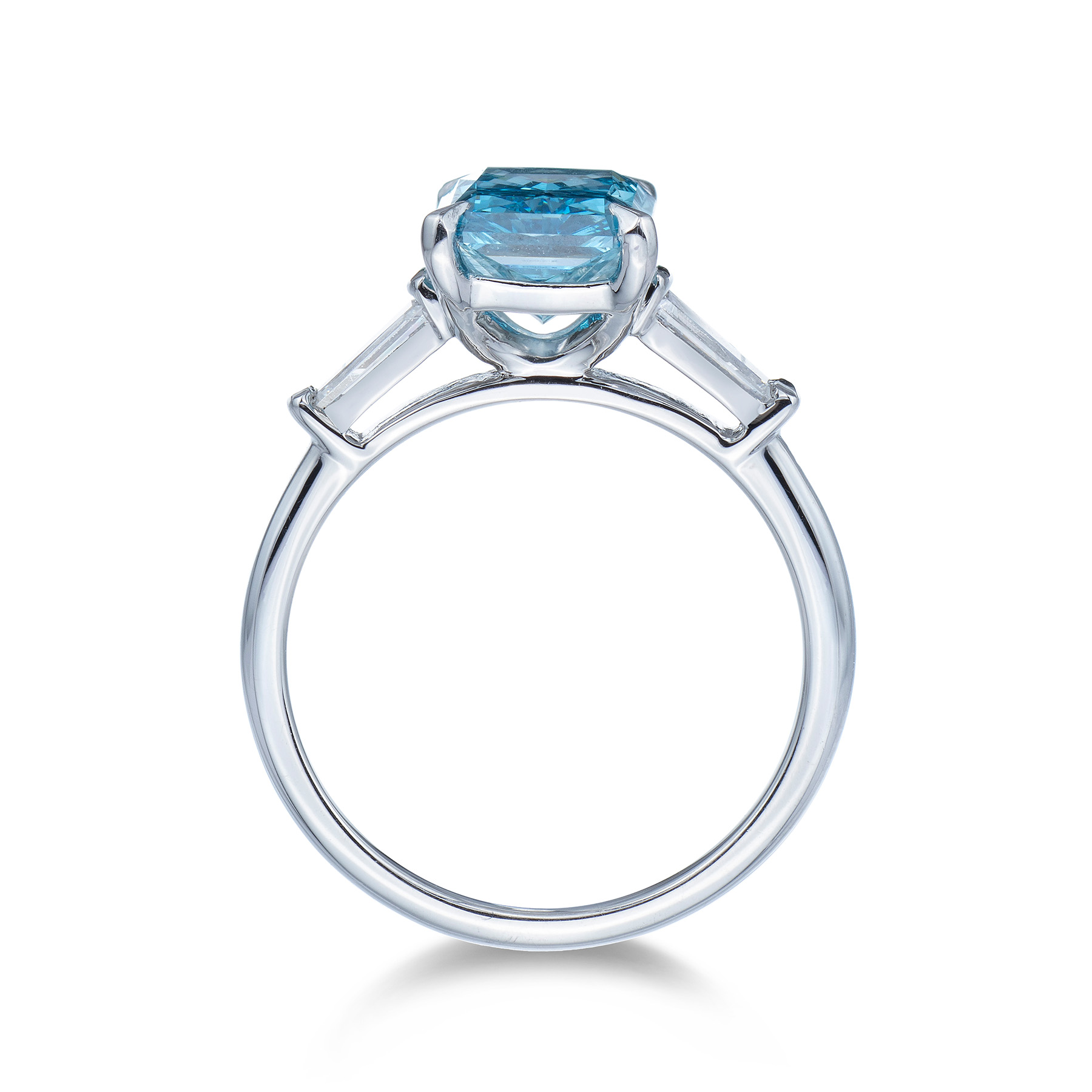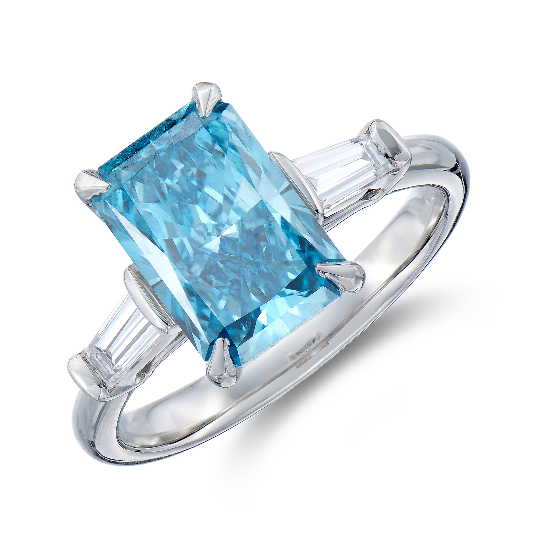 Set with one absolutely gorgeous "Fancy Vivid Blue" radiant cut lab grown diamond, bound in four elegant talon shaped claws, with each shoulder adorned with a striking tapered baguette cut lab grown diamond.