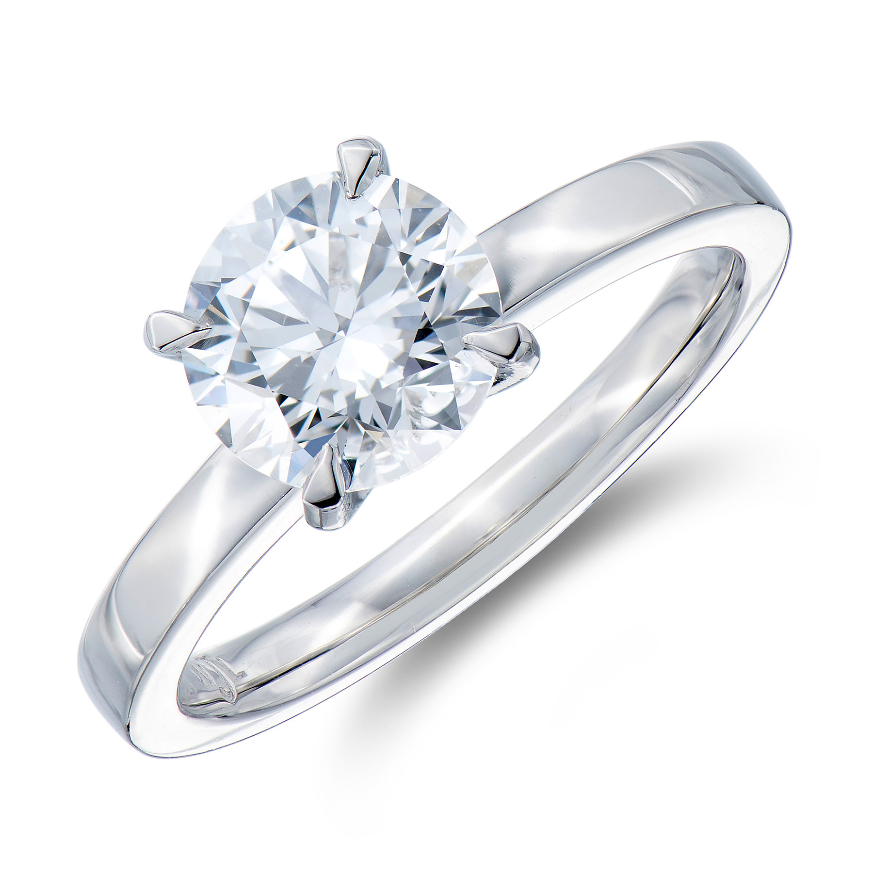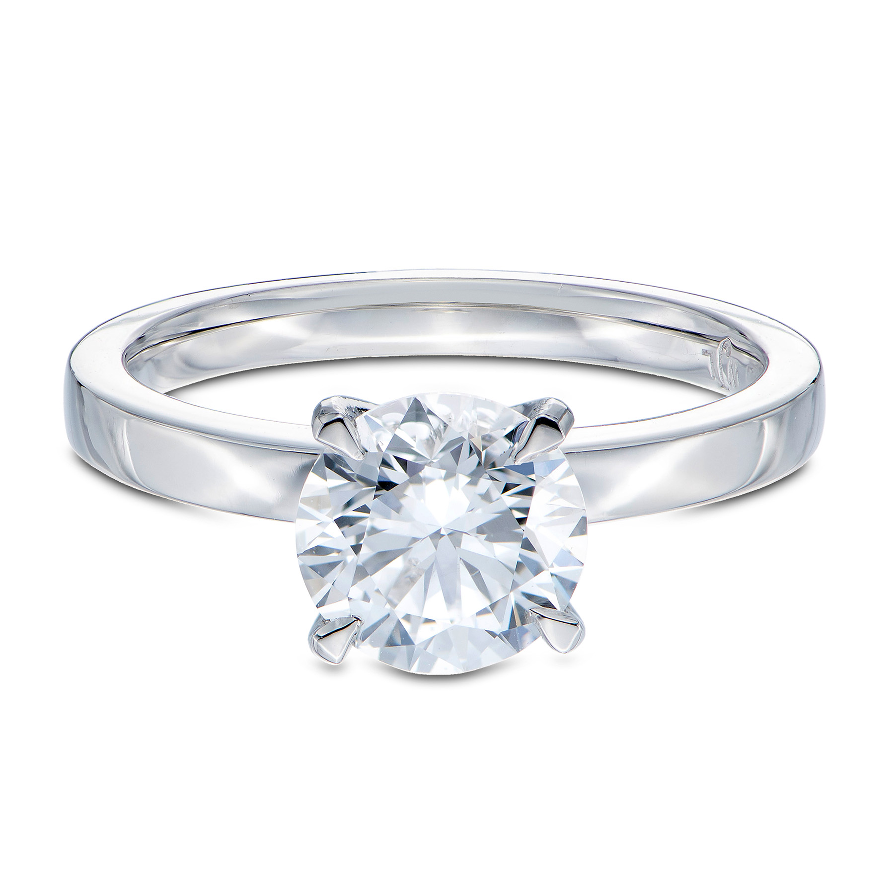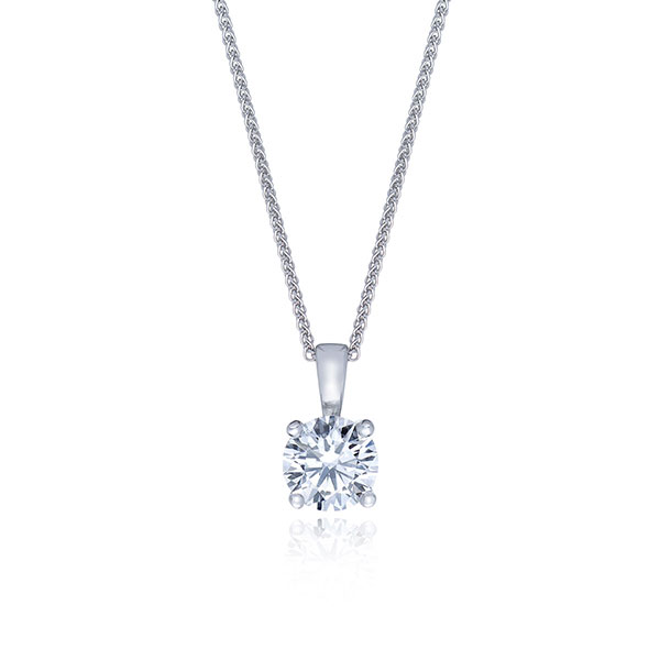 A beautifully classic solitaire ring set with one stunning IGI certified round brilliant cut lab grown diamond bound in an elegantly open four claw platinum setting.