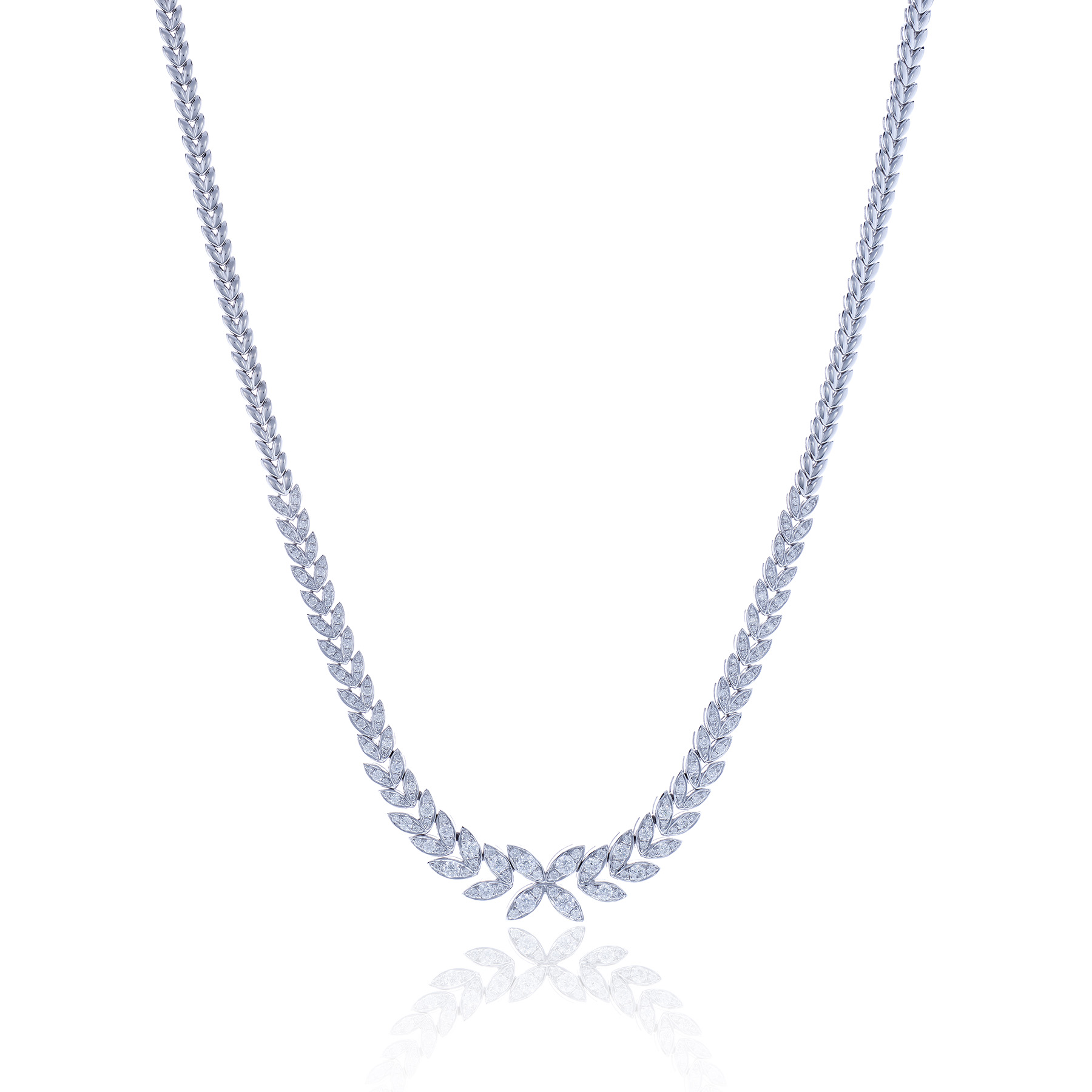 This exquisite piece is beautifully adorned with over 2.50ct of sparkling round brilliant cut diamonds. Each set in a elegant pave marquise setting, bound together in a 18ct white gold a delicate floral design.