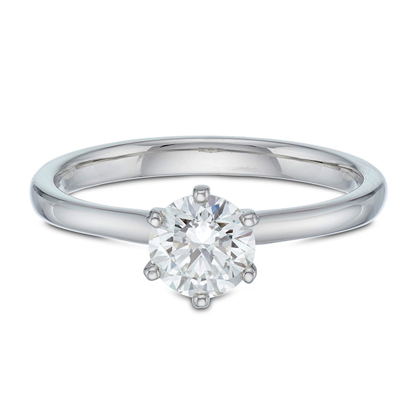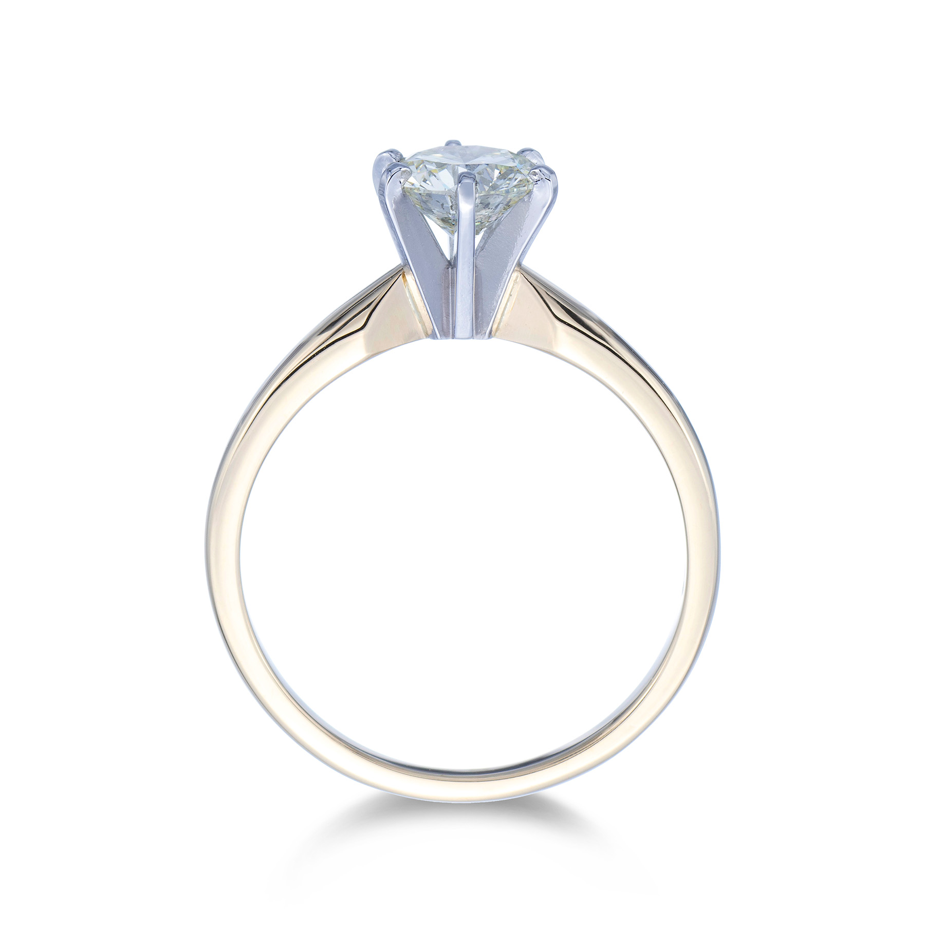 The true classic single solitaire ring with one beautiful round brilliant cut diamond, set high in platinum with traditional, six claw crown setting on a classic 18ct yellow gold band.
