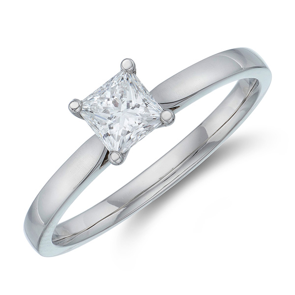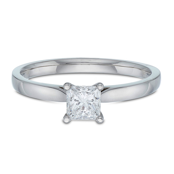 This elegant and timeless classic single stone solitaire ring is set with one stunning GIA certified princess cut diamond, bound in platinum, with a beautifully open four claw setting and a subtle cross-over designed shoulder.